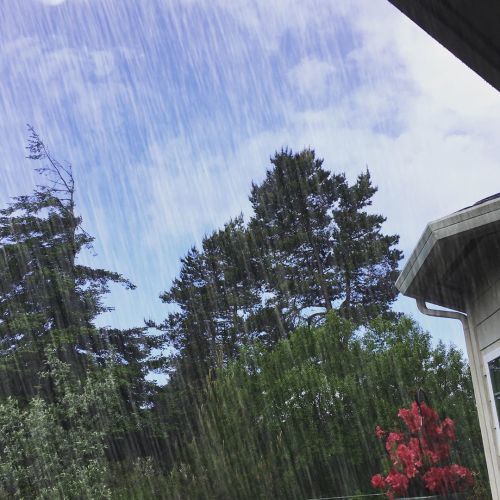 Bright blue skies and pouring rain. The weather seems a tad bipolar. Though I do love sitting on the covered porch while dreaming up new things to write. So little time and so many characters to kill.
