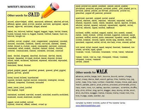 A fellow author, Tamar Hela, convinced me to share my list. If you would like a full PDF version, you can find it on her BLOG here:http://tamarhela.wordpress.com/2013/07/08/writer-tips-synonyms-for-said-and-walk/