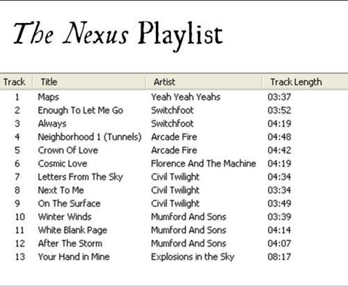 I was asked if there was a playlist for THE NEXUS. Why, yes. There is. Here you go! Enjoy!