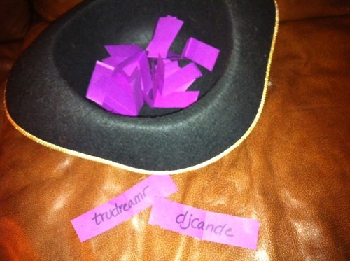 Btw, when I asked my husband to draw names he started to reach for the hat and then quickly...
