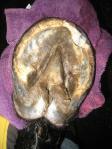Once the entry spot was located, excavated with a knife and then drained (the surprised expression of relief on River’s face was comical), the resulting inch-deep hole had to be kept clean and protected to allow the horse’s physiology to regenerate the sole.