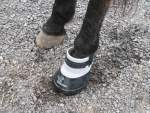 My vet recommended soaking the hoof in Epsom salt water for thirty minutes. A friend loaned me her Soaking Boot (an equine galosh that secures around the ankle) which was a godsend, as River thought that keeping his foot in a bucket of water was a stupid idea. After soaking, per my vet’s instructions, I filled the hole with a poultice of sugar and betadine antiseptic to draw out any remaining infection. I covered the poultice with a square of gauze and duct-taped it into place, with the tape covering the bottom and sides of the hoof, but below the hoof’s hairline. Finally, I latched a device called an Easy Boot (in my case, a Not-Remotely-Easy Boot) onto the hoof and hoped it would stay on. The next day River and I would do it all again.