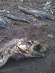 Next, we drove to the county park, which is a mile upstream from our old house. With the exception of the deep slice the new river had cut in the east side of the lake bed, the rest was untouched. A mile of perfectly smoothed basalt rocks spread in front of us; we pocketed a few and kept walking. Dead salmon, caught below the dam and released above before the breach, rotted in the rocks. Mike found an old cork handle to a fishing rod.