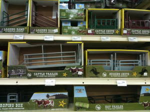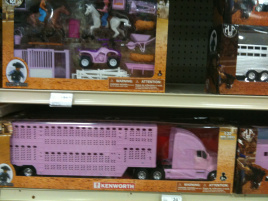 While visiting Burns, Oregon, in June I stopped by Big R, a farming and ranching supply store chain. They have everything! Horse tack, rat traps, ammunition, cowgirl fashion. I bought a pair of Ariat lace-up boots while I was there in 2009 and still wear them on a regular basis. On the way to see the new boot styles, I passed through the toy section. The toys include kid versions of what the grown-ups use—in this case not miniature condominiums and SUVs, but replica rodeo equipment and rifles. Lifelike for the boys and pink for the girls.