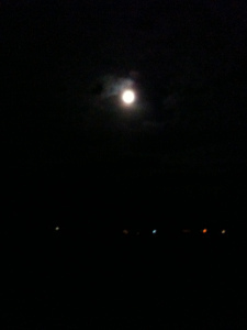 My only camera is in my phone, so the following photograph does not begin to represent the silver-edged beauty of the clouds and the ethereal state of “nightday” that the land takes during a full moon. I could have gazed at it for hours.