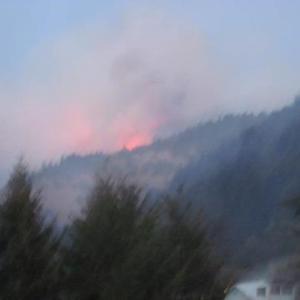 My friend Jeff, who lives north of Husum and has become something of a one-man news outlet for valley residents, took this shot on Wednesday evening while driving in a small group of cars that were being escorted through the fire zone. On Facebook, he wrote, “This was a tree that was crowning (official fire speak for ‘going up like a roman candle’) only about 10 feet off the highway.”
