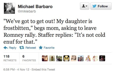 Romney staff is holding children hostage at a frostbitten rally right now, according to NY Times reporter Michael Barbaro and USA Today’s Jackie Kucinich.