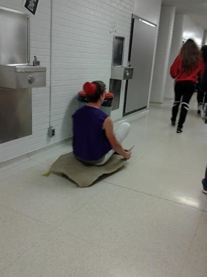on halloween this guy dressed up as aladdin and glued a carpet to his skaboard and made his way through the halls like this