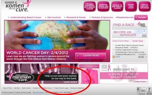 The switch was simple, but the message was clear: A banner previously calling women to join a run aimed at ridding the world of breast cancer now read "help us run over poor women on our way to the bank."