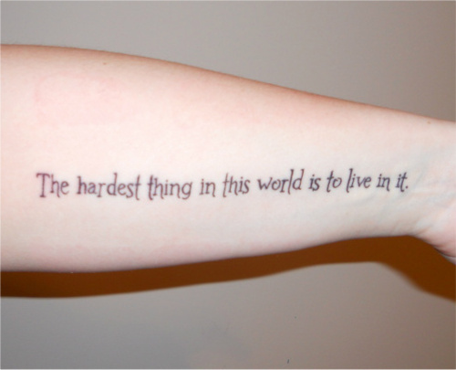 This is my fifth tattoo and it was done by Tony at Greg's Tattooing in Wheeling, West Virginia. It's a quote from Buffy the Vampire Slayer (S05E22), a show that has inspired me since I was a kid and helped me through the good and bad times in my life. Buffy said this to her sister before she saved the world and died, in the hopes that her sister would be able to keep living even through her death just months after their mother died. It's a reminder to always be strong, to always live, even when it feels like the world is ending.