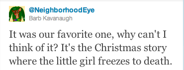 My mom used to read us this story every year. "The Little Match Girl," by Hans Christian Anderson. The ending always made us sad and my mom would tell us that if nobody on this earth loved you, you just died automatically. It was scary at the time, but now that we're older, my siblings and I are very cognizant of population rates and know that it's pretty hard to strike out THAT bad. But still, it's a good reminder to get out there and network from time to time.