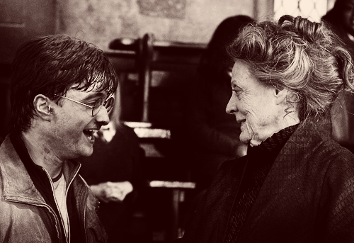 "Well she got me the job at Potter, practically, so for anyone who doesn't know that story, I basically owe everything to Maggie Smith because I worked with her on David Copperfield and then she came on to Potter as McGonagall and said to the director, 'You need to audition this boy.' So I kind of owe her everything, so to Maggie I just say my fairy godmother." — Daniel Radcliffe (on the first thing that comes to mind about Maggie)