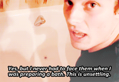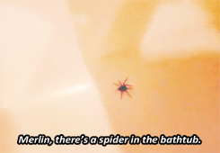 reincarnation!merthur - in which the once and future king has returned with a completely rational fear of spiders, merlin refuses to use his magic to rid the beast from the bathtub, and if youtube’s still around when arthur retakes his throne, this video is most definitely going viral.