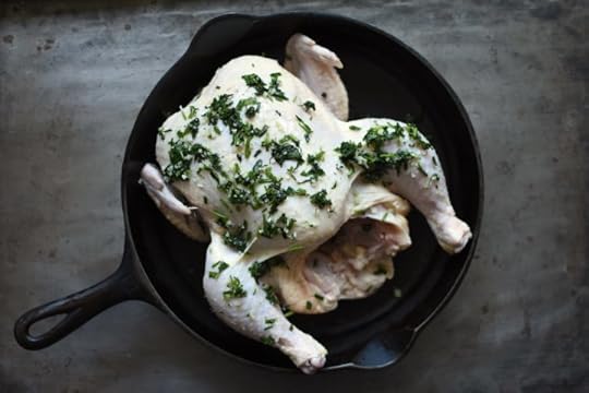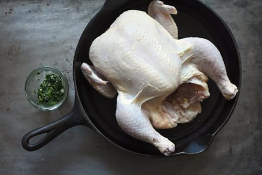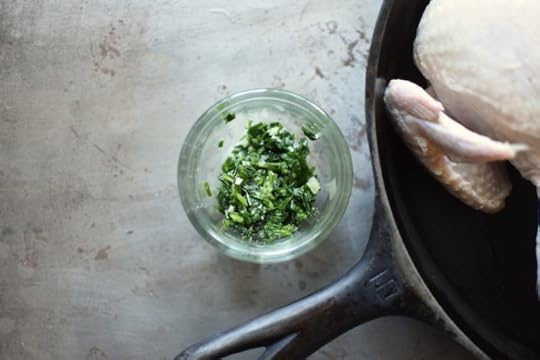 Before the month is over, I wanted to show you one of my favorite ways to use these salt preserved herbs. Roast chicken. I like to spread a thin layer of the salt preserved herbs over and around a chicken, let it rest in the fridge a little while, and then roast it at high heat (425°F/218°C or more, depending on what else needs to be in the oven while it’s cooking).