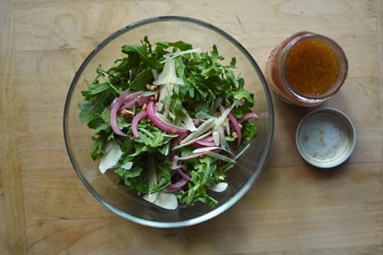 Tonight, I had several of the necessary building blocks and got to work. I piled baby arugula into a bowl and added the pickled red onions (a fridge staple around these parts) and toasted almonds. There was no goat cheese, so I swapped in some shaved parmesan instead. There was nothing akin to the roasted beets, so I skipped them entirely.