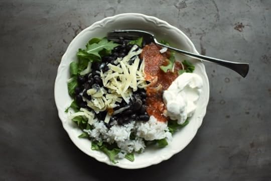 Scott left town the morning after we ate them together and I proceeded to live on the leftovers while he was out of town. Twice I ate them as pictured above, over rice and chopped arugula and topped by sour cream, grated cheddar, and a scoop of homemade salsa. Later, I stirred them together with the remaining rice and salsa, along with some baby spinach and turned them into a soupy, pseudo-casserole that made a very nice lunch.