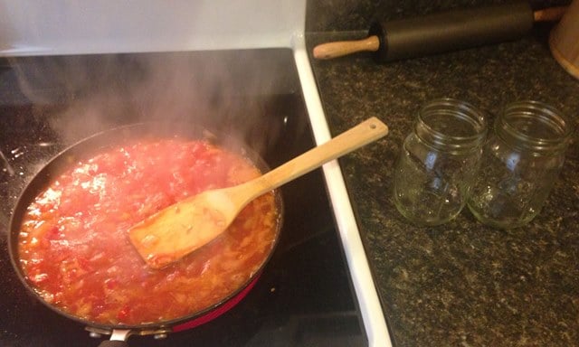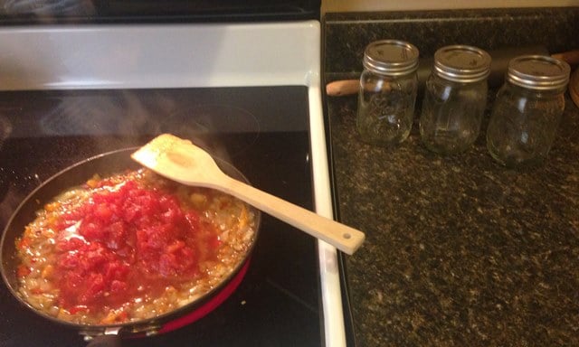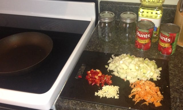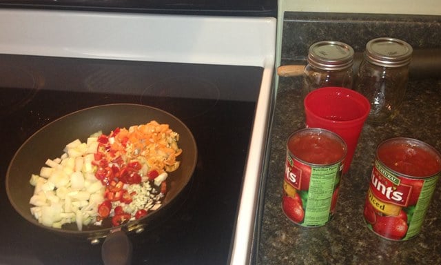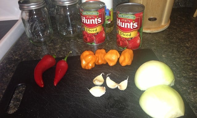 I first started by laying out all of the ingredients. As you can see, there are the empty jars, Hunt’s diced tomatoes, red chile peppers, habanero peppers, minced garlic, vegetable oil and onions. Additional ingredients that were not in this picture include chili powder, salt, sugar and white distilled vinegar.