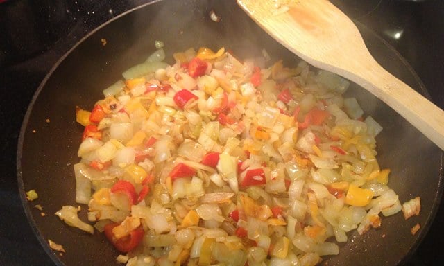 I poured the vegetable oil into the frying pan and then added to the peppers, garlic and onions. Cook them over medium-high heat until the onions begin to brown.