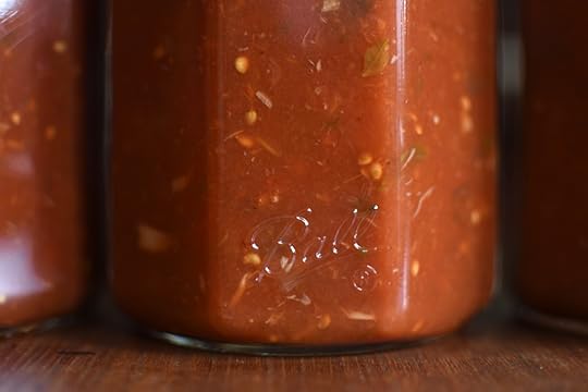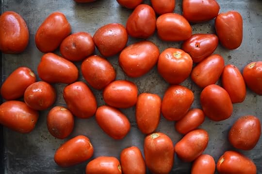 This month, we’re talking tomatoes. In my area, they are finally starting to show up at farmers markets with heady abundance. I am buying them 10 or 25 pounds at a time in order to put up enough various tomato products to get me through the year (my goal is to do enough tomato puree, whole peeled, and salsa to get me through to next August).