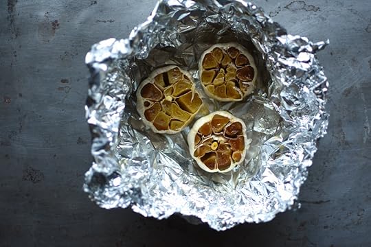 Once the tomatoes are prepped, you add some chopped onion, three heads of roasted garlic, fresh basil and oregano, and a little salt. Heat to a low simmer and cook until thoroughly warmed through (I confess, I reduced mine a little as the tomatoes put off a good bit of water).