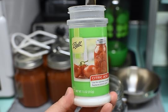 Once you judge that the sauce is done, remove one jar from the canner. Add 1/2 teaspoon citric acid (you could also use 2 tablespoons bottled lemon juice if you prefer), and funnel in some of the sauce, filling to 1/2 inch headspace. Stir with a wooden or plastic chopstick to remove any trapped air bubbles. Wipe the rim, apply a lid and ring, and place the jar back in the canner. Repeat with the remaining jars and sauce.