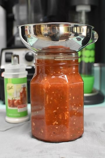 Funnel the finished chutney into the prepared jars, leaving 1/2 inch headspace.