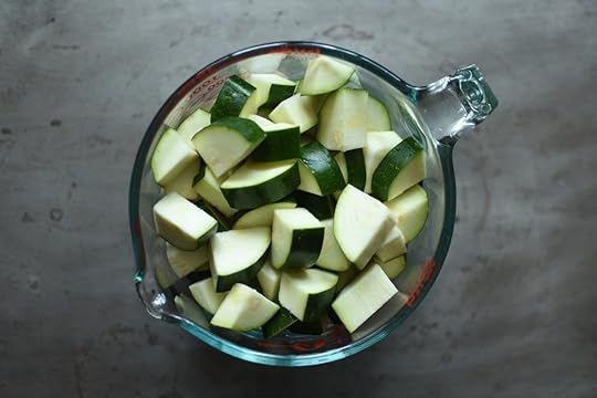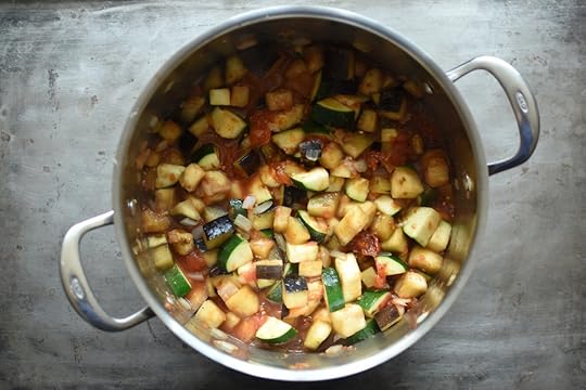 You start the way so many of these things start. But warming a couple tablespoons of olive oil in a roomy pot and adding a chopping onion. Once that onion begins to color, you add a cubed eggplant (no need to salt or drain) and stir it well into the onions, so that it will also start to brown a bit. Then you add the zucchini and a couple crushed garlic cloves and work them in.