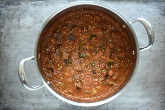 Once the tomatoes are peeled, you squeeze out the seeds, chop them roughly and heap them in a pot (the tomatoes you see pictured above were just the peeled halves. I seeded and chopped after this).