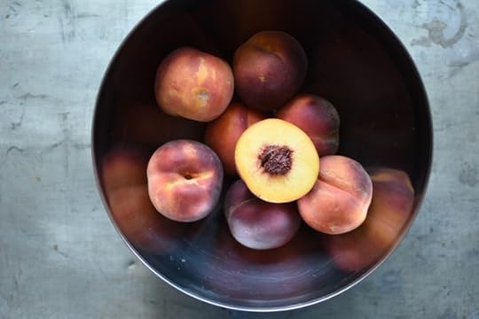 Cut the peaches into quarters and remove the pits. Heap the peach pieces into a heatproof bowl and put the bowl in the sink.