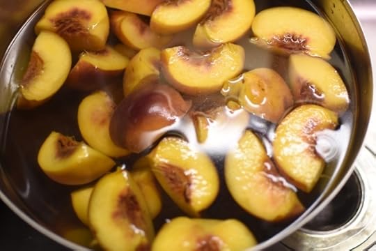 Remove the peels from the peaches and cut each quarter into 2 to 3 slices. Place the peeled peach slices into a medium, non-reactive pan.