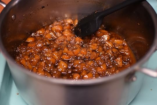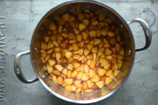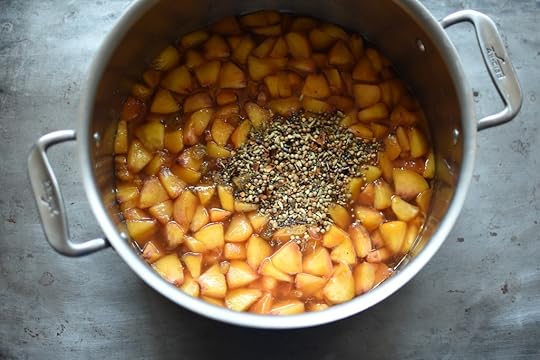Add the toasted spices to the peaches and stir to combine. Place the pot on the stove over high heat and bring to a boil. Reduce the heat to medium-high and cook, stirring regularly, until the liquid reduces, the peaches darken and soften, and the total volume has reduced by at least one-third.