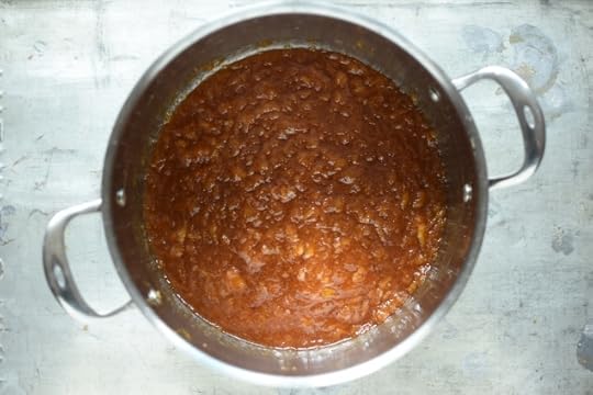 While the sauce heats, prepare a boiling water bath canner and three quart jars.