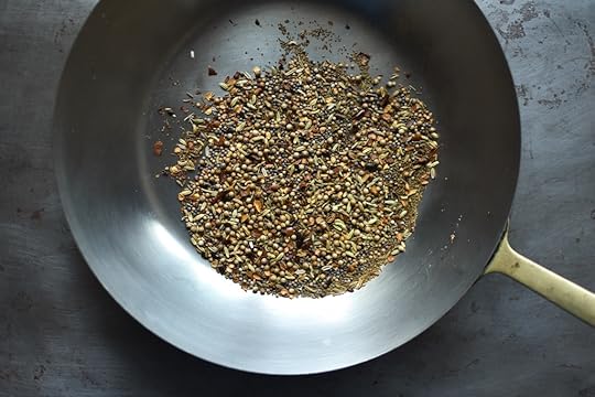 In a dry skillet, combine the spices and toast over medium heat for 2-3 minutes, stirring constantly. They are finished when the mustard seeds begin to pop.