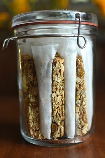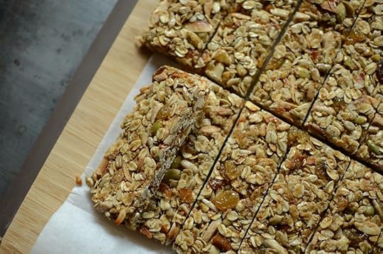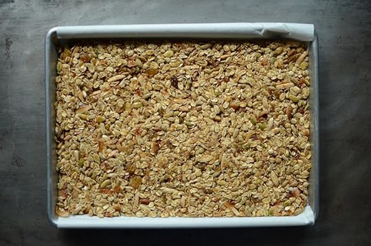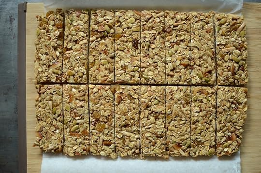 Scrape the batter into the parchment-lined pan and pat it out with the bake of a spatula into an even layer. Let the slab cool to room temperature. Cut into 16 bars. Wrap them in plastic or more parchment paper and store in a zip top plastic bag or a large, glass jar.