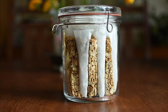 Once the slab is cool, I cut them into bars, wrap them up in pieces of parchment paper (often using the same sheet that I lined the pan with) and then tuck them into a big jar.