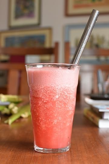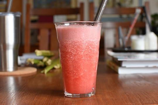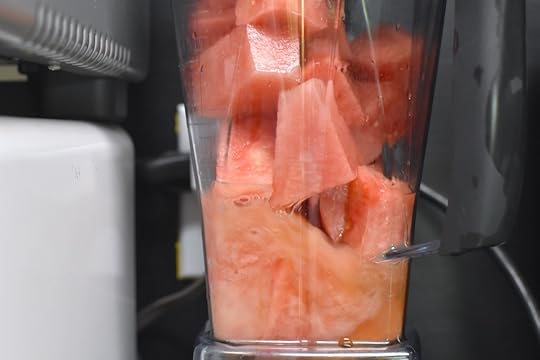 The prior weekend, I had spent some time with a friend who had mentioned how much she liked the watermelon juice sold at a local-to-her taco truck. I cubed the watermelon and threw it in the blender with the juice of a lemon (lime would have also been good) and a tablespoon of agave nectar (I had a bottle that was nearly kicked and I wanted to use it up. Honey or even maple syrup would also be good).