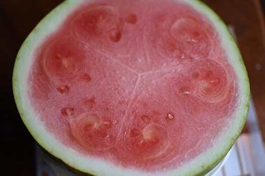 I tapped a few melons and lifted a couple possible candidates into the air, hoping to find a good one using both science (hollow sound) and intuition (feel). Hoping for the best, I finally hefted a gorgeously striped watermelon into my cart. Walking home with one bag on my shoulder and the watermelon cozied up in my favorite mesh sack, I was so looking forward to eating a bowl of melon cubes.
