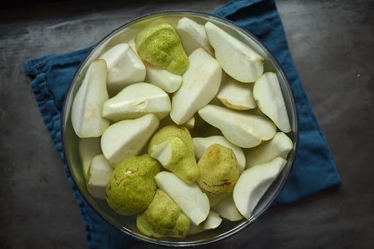 As you work, place the cut pears into a bowl of acidulated water (that’s a fancy word for water spiked with either lemon juice or Fruit Fresh) to prevent the pears from browning.