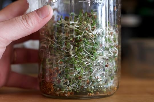 By day three of rinsing twice a day, I definitely had sprouting, as you can see in the photo of the alfalfa seeds with their tiny, just-emerging shoots.