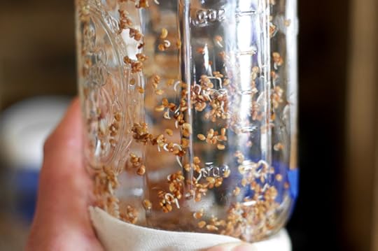 Once your seeds are sanitized, add water to submerge your seeds, then let them soak overnight. In the morning, drain your seeds, rinse them, and drain again so that no water will be left standing in the jar. Top with cheesecloth secured with a rubber band, or use a sprouting lid.
