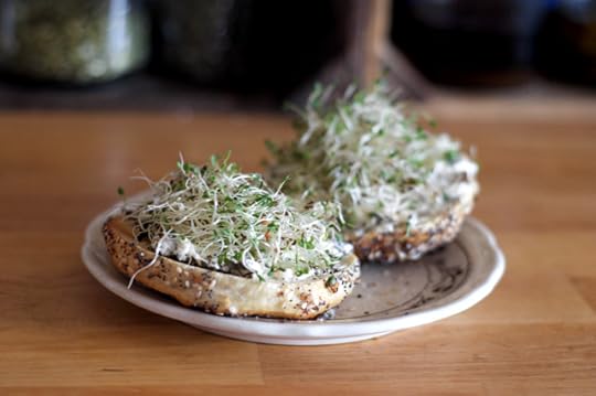 By day five, both the broccoli and the alfalfa sprouts were ready to eat. I transferred them to a fresh container with half a paper towel in the bottom and put them in the fridge. They were delicious on my bagel with some herbed fromage blanc this morning — crunchy, fresh, green, and nutritious.