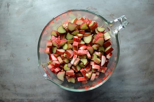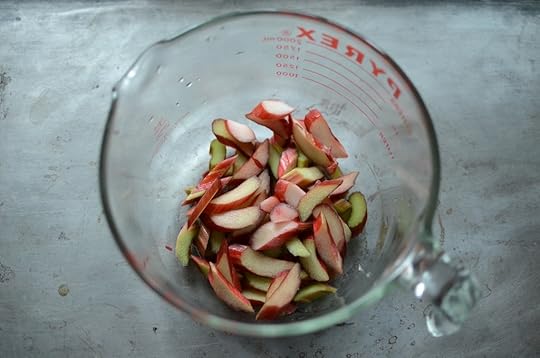 Once home, I cleaned the rhubarb, cut away the sad ends, and cut it all into half inch-wide slices. It filled my largest measuring cup, which felt just right in terms of the batch size I wanted.