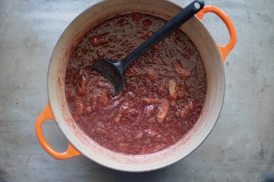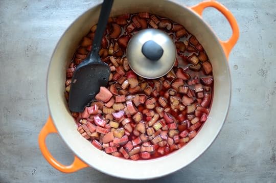 I held about 1/2 cup of the rhubarb back from the pot, to stir in at the end. Rhubarb collapses as it cooks and I wanted the finished jam to have some texture. By holding some back to stir in at the very end, you end up with a bit more elemental rhubarbness in the jam.