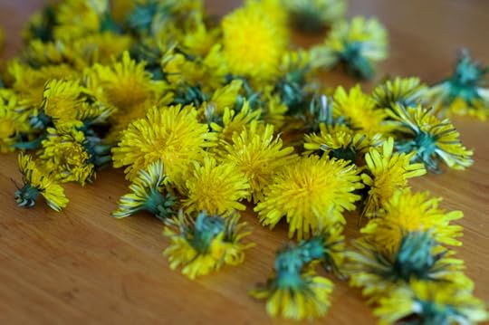 To make this delectable treat, find a field or lawn where you can be sure that the plants haven’t been sprayed and the soil is not contaminated (the front yard where I live fits the bill here, but there are plenty of urban green spaces with dandelions that I wouldn’t use for food — so select your site carefully). The dandelions should be in full bloom, big and fluffy and bright yellow.