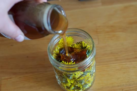 When you get back to the kitchen, go over your blooms carefully to make sure you’ve removed any bits of grass, leaves, or stems and any hitchhiking insects. It was too early for spring honey, but I had a jar of local wildflower honey (probably from last fall’s harvest) on hand to infuse.