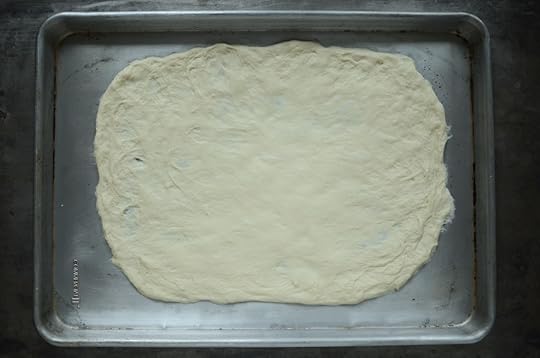 Once the dough has had a chance to rise and the onions are cooked, it’s time to make some pizza. Take a half batch of the dough (most recipes, including the ones in this book, make enough for two pies) and work it out as thin as you can on a sheet pan.