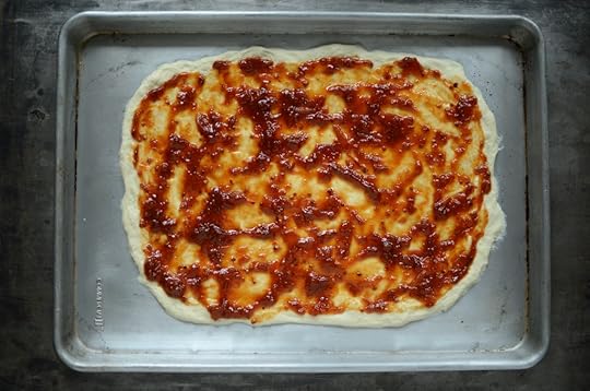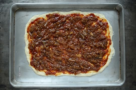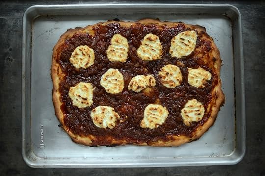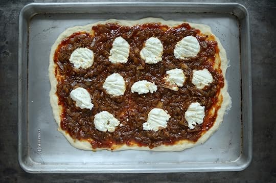 Top the flattened dough with a thin layer of tomato jam, a more generous layer of caramelized onions, and goat cheese (you can also use a combination of goat cheese and feta, if you prefer something a bit zippier in flavor).