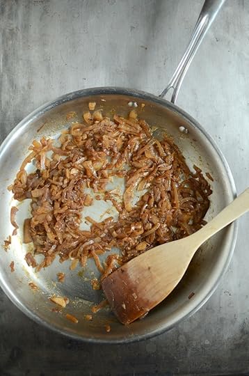 While the dough rises (of course, you can also use store bought dough if that’s easier), you caramelize some onions. Ken says it should only take about 12 minutes, but I prefer a much longer cook and let mine go for about 45 minutes, until they were honey-hued and nearly as spreadable as room temperature butter.