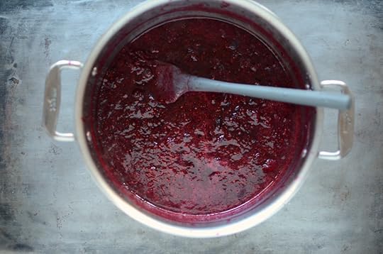 Place the pot on the stove over high heat and bring to a boil. Reduce the heat to medium-high and cook, stirring regularly, until the jam thickens. This should take between 20 and 25 minutes. Because of the presence of the cranberries, this jam will pass the sheet test on a spatula.