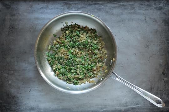 Heat the olive oil in a medium skillet set over high heat. When the oil shimmers, add the onions, and garlic and cook for 4-5 minutes, until the onions are tender, brown, and fragrant (add a splash of water if the onions are cooking too quickly). In the last minute of cooking, add the parsley, salt and pepper. Remove from the heat and allow to cool.